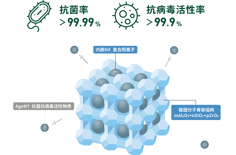 采用特制硅铝酸盐分子框架结构,内载银锌双效复合活性因子,通过表面植入技术搭载于板材面层,可有效吸附并杀灭细菌和病毒。经权威机构检测,产品抗菌率≥99.99%,病毒灭活率≥99.9%,全面保障您和家人的健康安全。