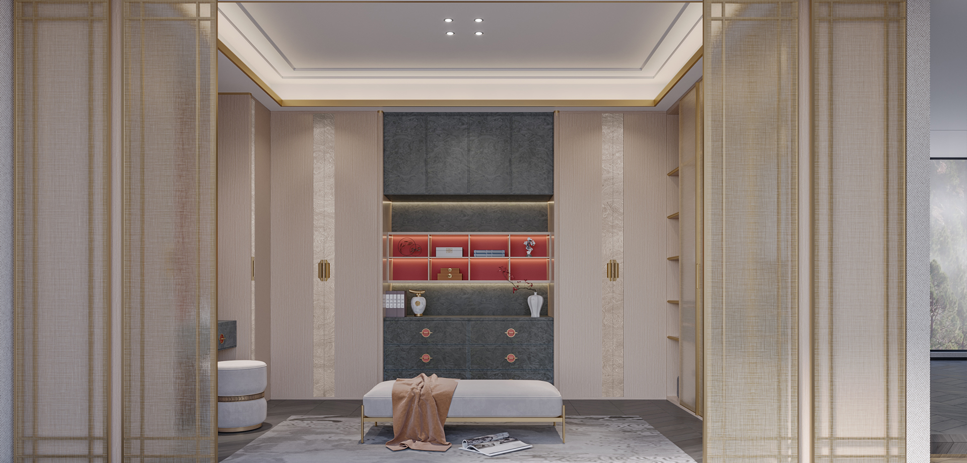 铝框包边亚克力发光层板灯与哑金金属架的融入使整体组合更加的丰富灯光的加入烘托整体空间的氛围感。