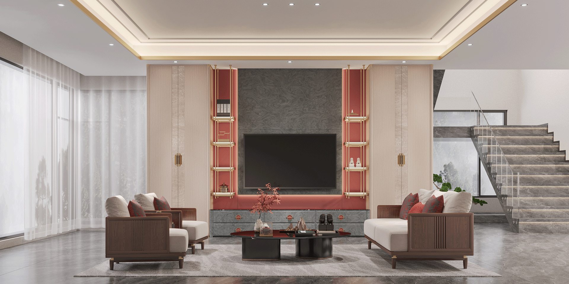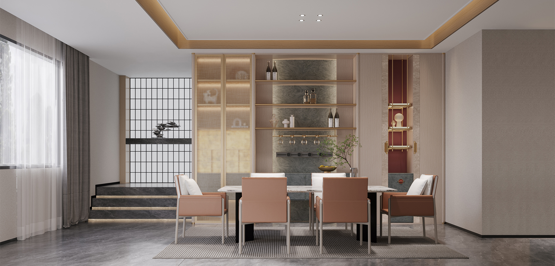 岩板台面圆角岩板台面与圆弧木皮工艺装饰柱相结合,给冰冷的材质增添了柔和的美。