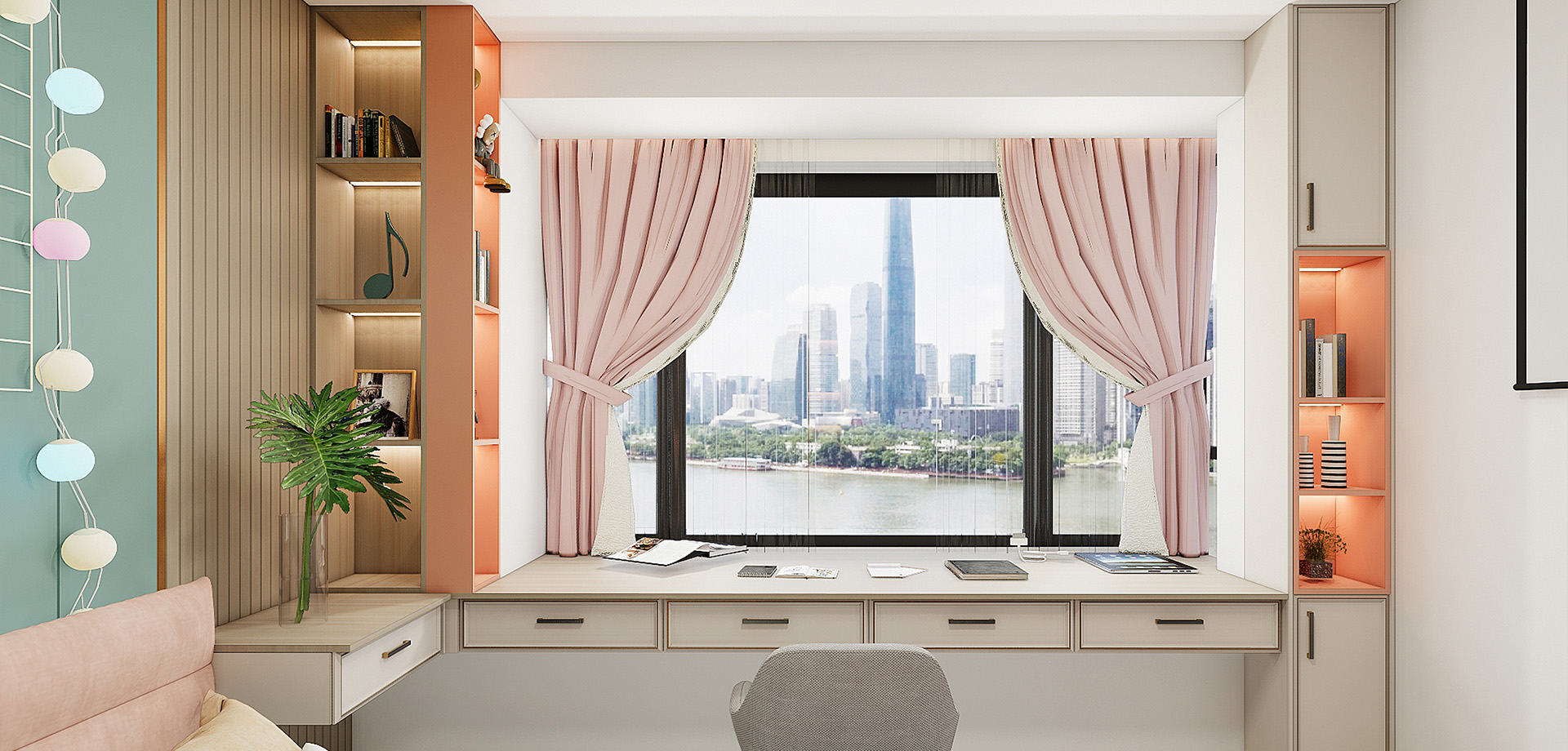 粉色沙发、吊椅与挂画,