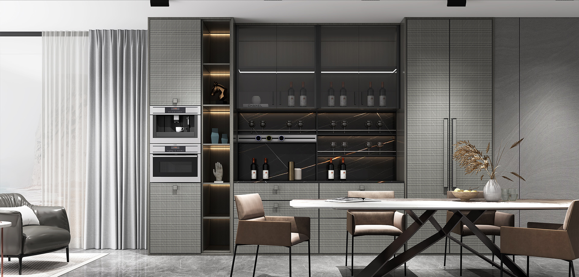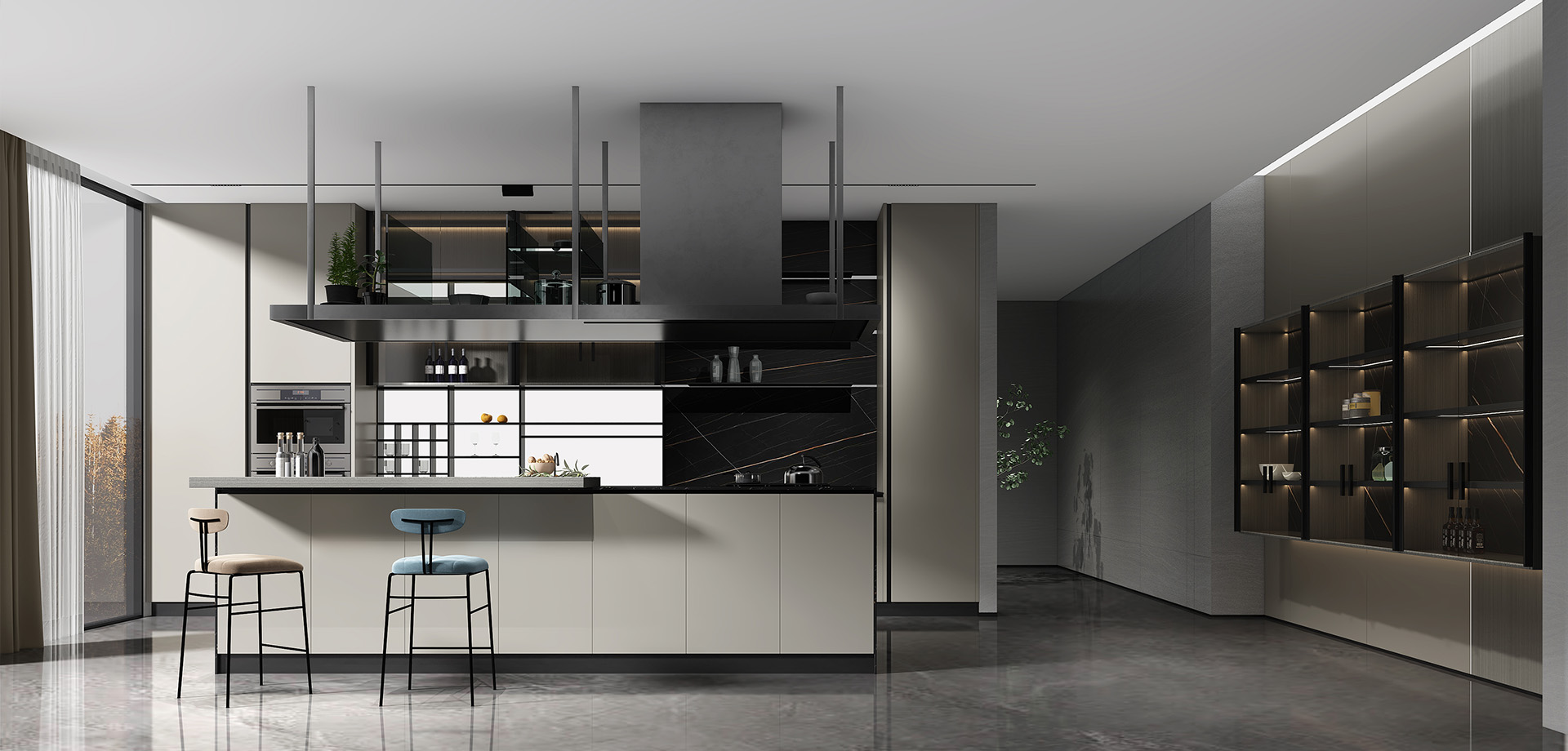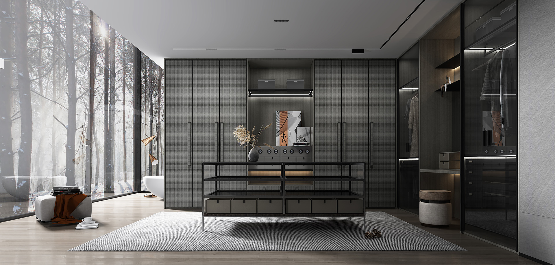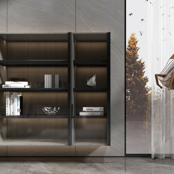 哑灰无框玻璃门、铝框玻璃层板、大理石纹跳色、