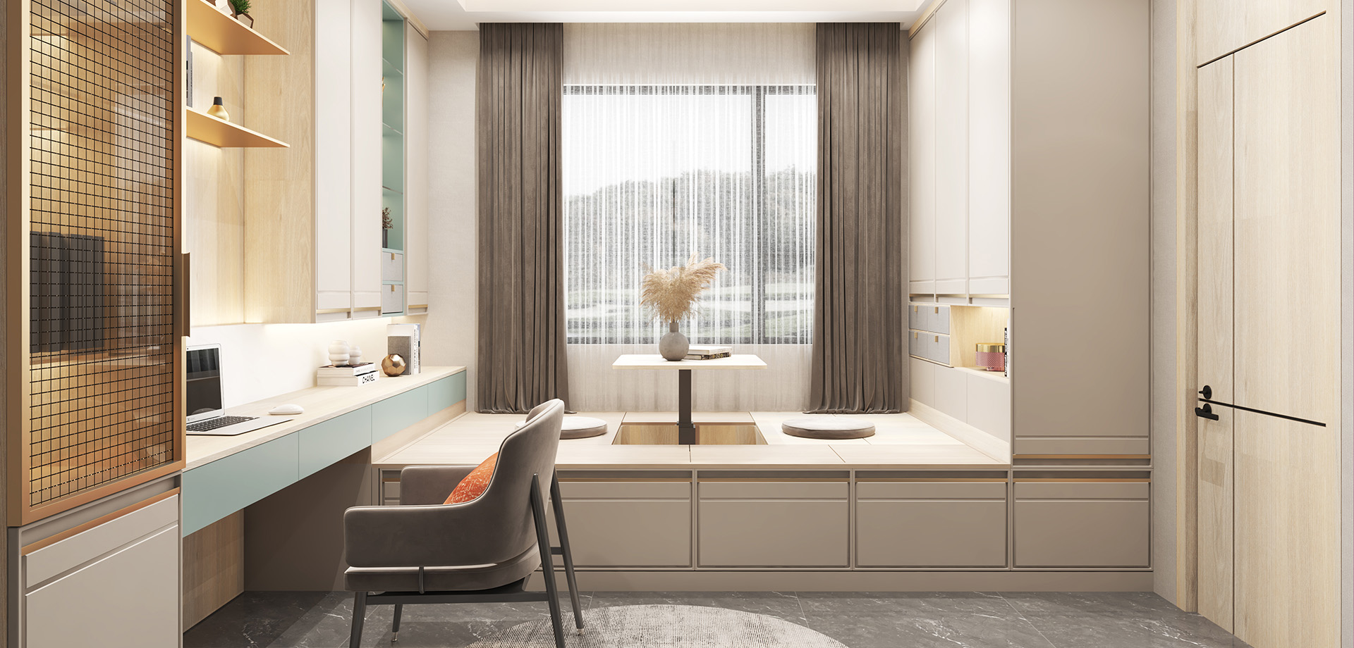 背墙收纳系统和电力轨道插座的加入让其功能更加齐全。
