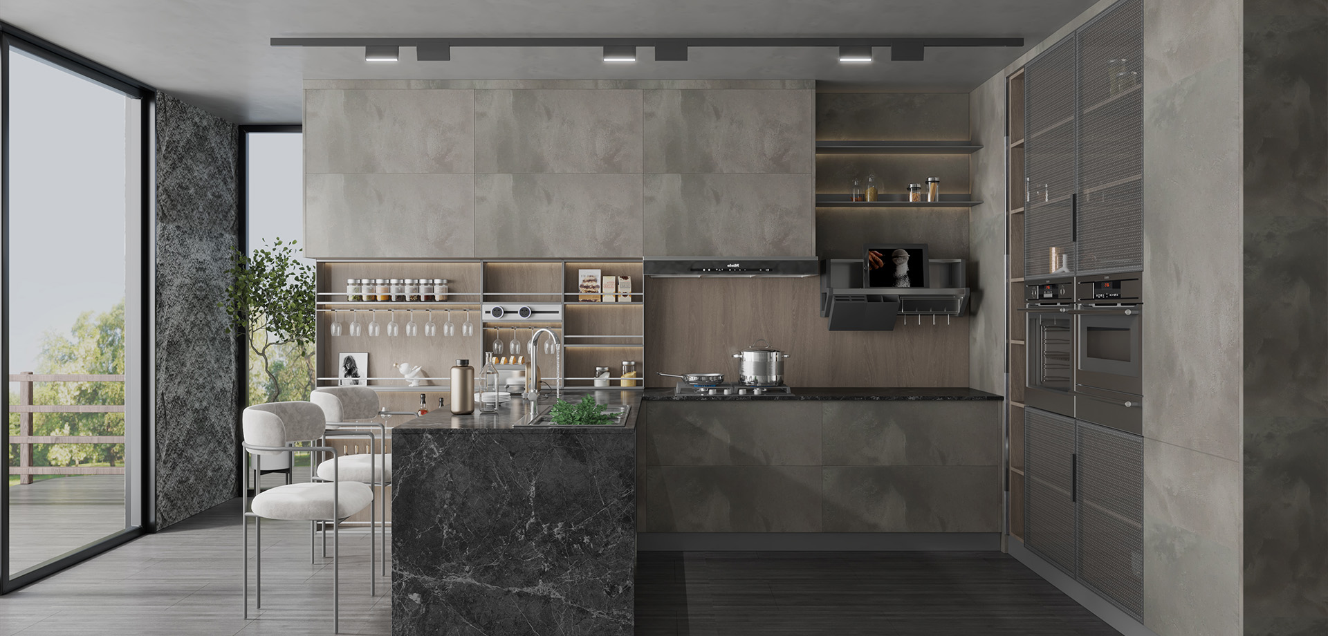 整体厨房呈F型布局,加大的岛台台面可做为简易用餐区。